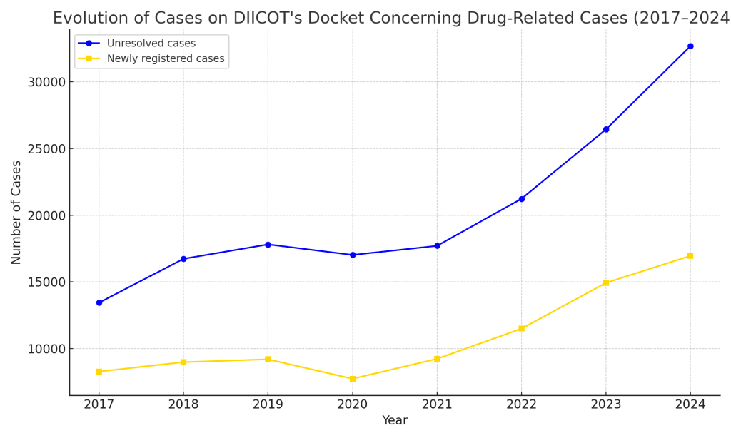 The report reflects a constant intensification of DIICOT’s activities in the drug field, without an analysis of the real impact on consumption or recidivism. An adaptation of the structure and investigation methods to new realities (technology, specialized structures, international cooperation) is observed. The massive seizures (cocaine, cannabis, doping substances) indicate both the scale of the phenomenon and the increased reactivity of the authorities. Criminal trends show a diversification of methods (online, crypto), an increased risk of domestic production, and a worrying involvement of minors. According to its own reporting, drugs are treated as the main operational priority by DIICOT, with important implications for national criminal policy.